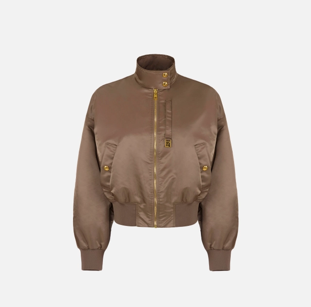 Nylon bomber jacket with oversized fit. The jacket has a high fabric collar and wide sleeves. The golden metal buttons add bright accents, and the pocket is decorated with a logo plaque. Finished with knitted cuffs and waistband.